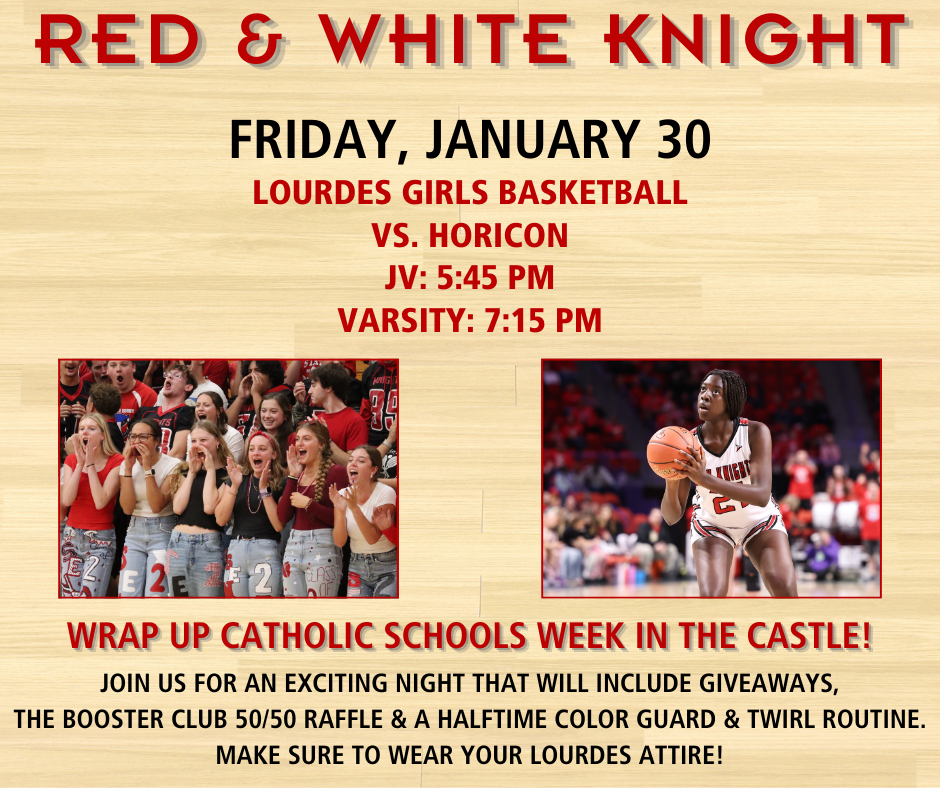 Where your red and white and cheer on the Lourdes Academy boys basketball team vs. Horicon! The event will include giveaways and the Booster Club Halftime Ball Toss!